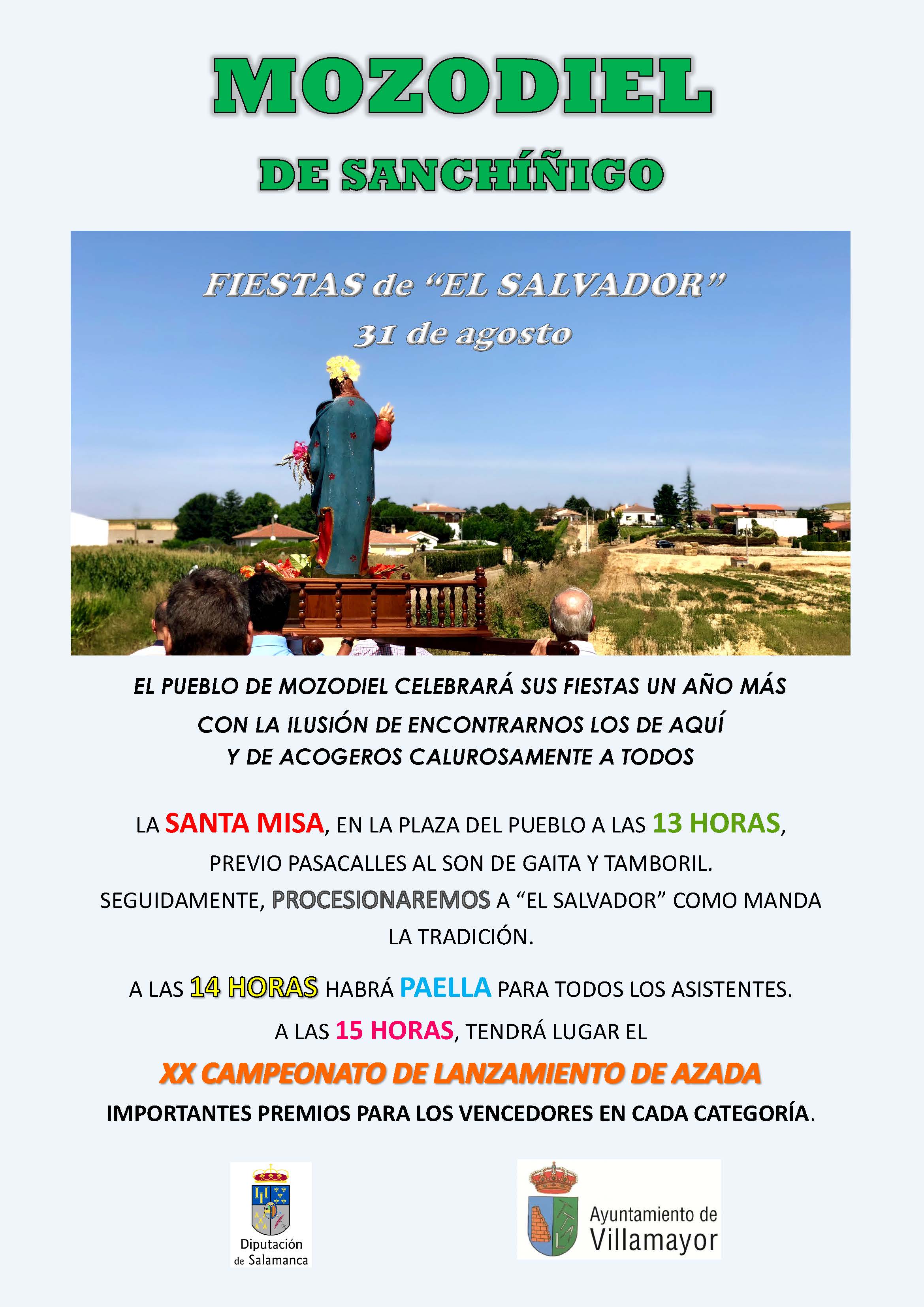 Mañana sábado, a partir de las 13:00, nuestra pedanía de Mozodiel, celebra la tradicional festividad en honor "Al Salvador". Después de la Santa Misa, a las 14:00, se ofrecerá una paella a todos los asistentes.