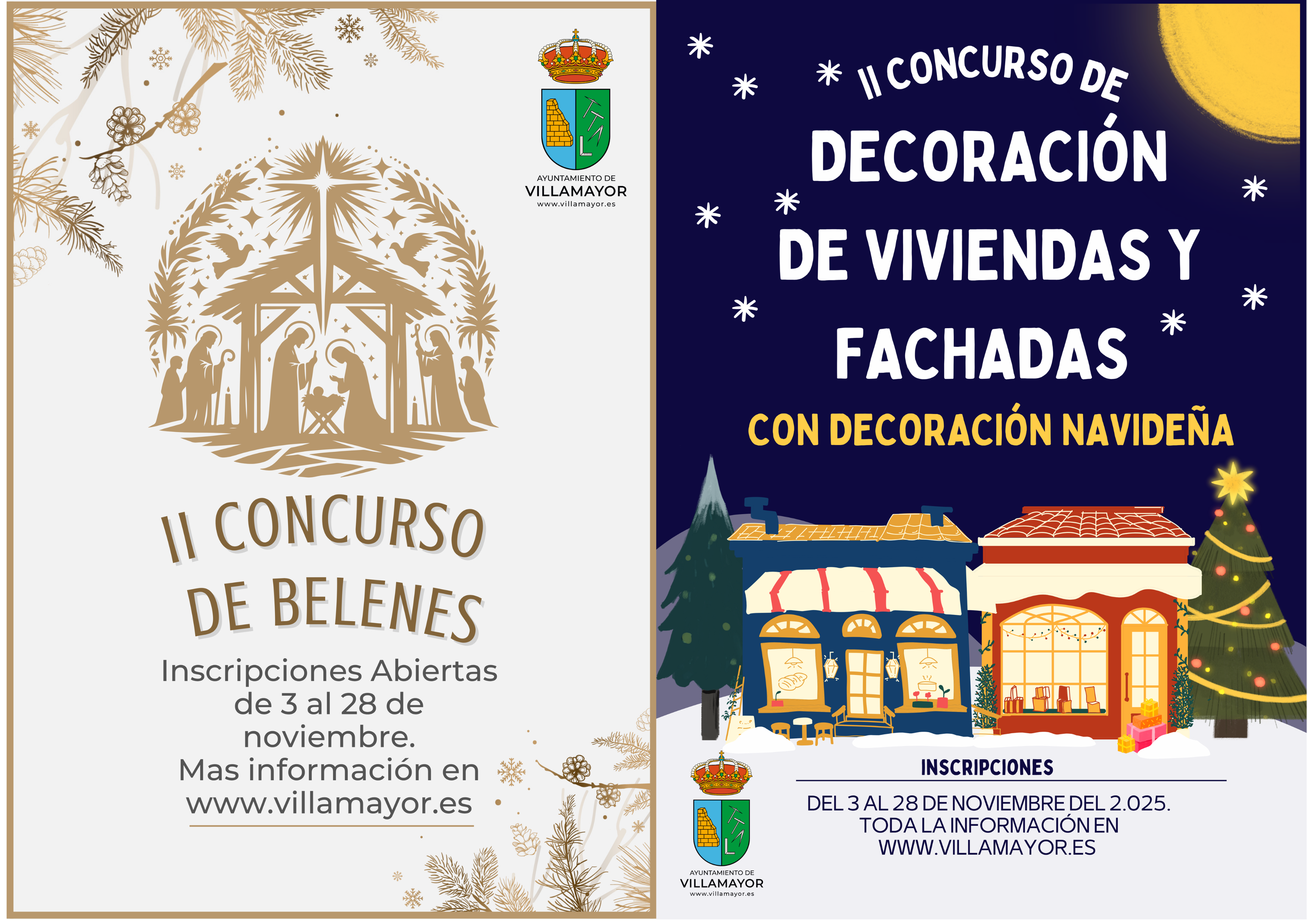 El Ayuntamiento de Villamayor informa de la apertura del plazo para la inscripción en los II Concursos Navideños 2025, que incluyen el II Concurso Local de Belenes y el II Concurso Local de Decoración de Balcones, Fachadas y Jardines, conforme a los decretos de Alcaldía que aprueban sus respectivas bases reguladoras