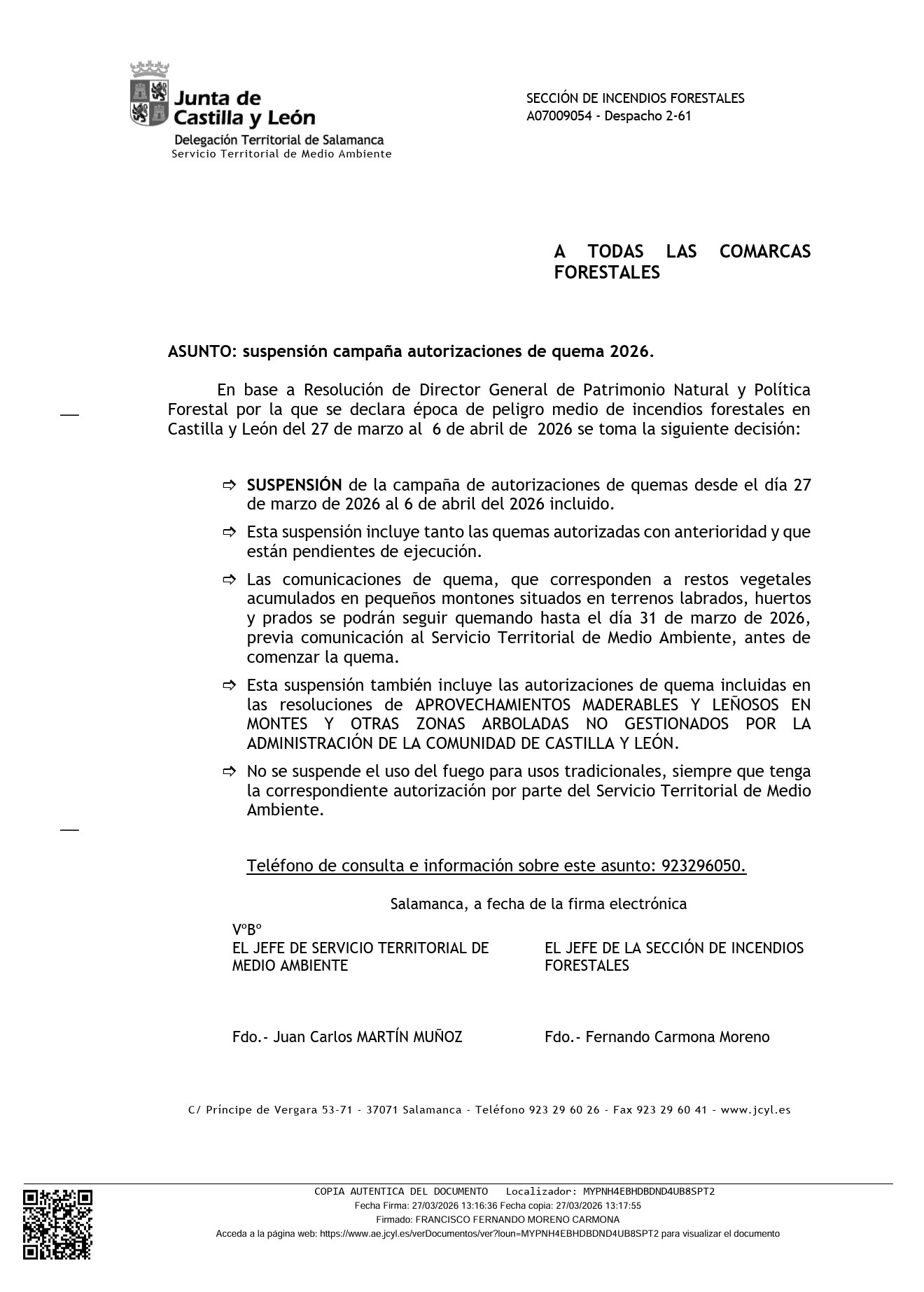 El Ayuntamiento de Villamayor informa a todos los vecinos que, conforme a comunicación oficial recibida de la Junta de Castilla y León, se ha acordado la suspensión de la campaña de autorizaciones de quema en toda la Comunidad Autónoma.