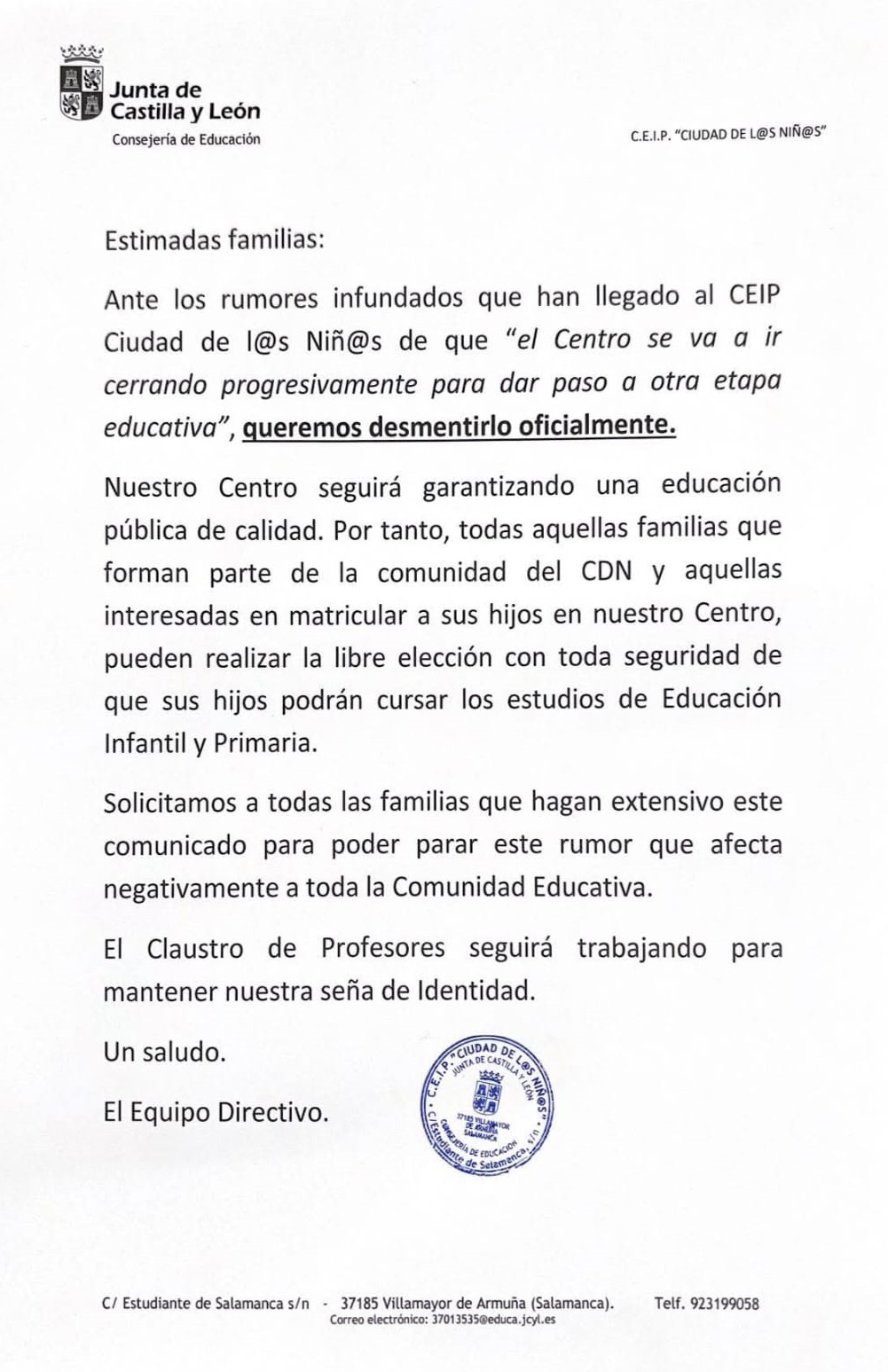 El CEIP Ciudad de los Niños de Villamayor de Armuña ha emitido una nota informativa dirigida a las familias con el objetivo de desmentir los rumores que han comenzado a circular en los últimos días acerca de un supuesto cierre progresivo del centro educativo.