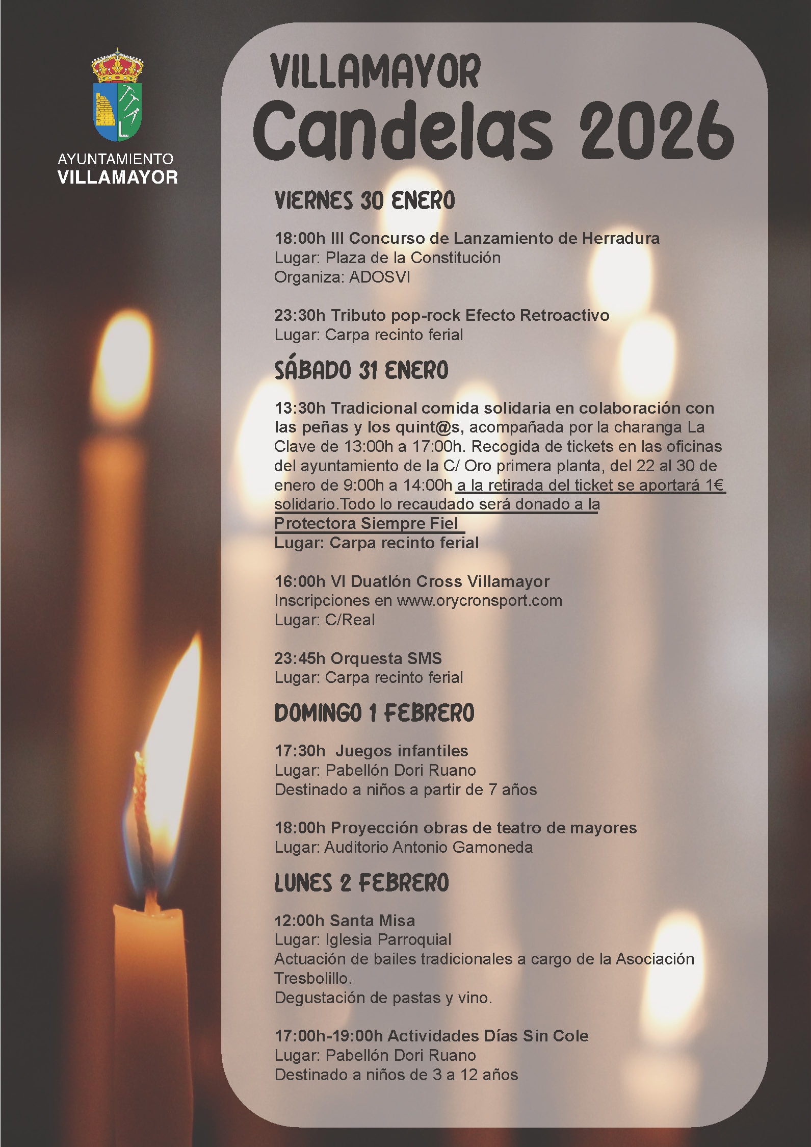 El Ayuntamiento de Villamayor invita a vecinos, vecinas y visitantes a participar en la festividad local de Las Candelas 2026, la primera gran cita festiva del municipio en el nuevo año, que se celebrará del viernes 30 de enero al lunes 2 de febrero, con una programación variada que combina tradición, deporte, música y actividades para todos los públicos.