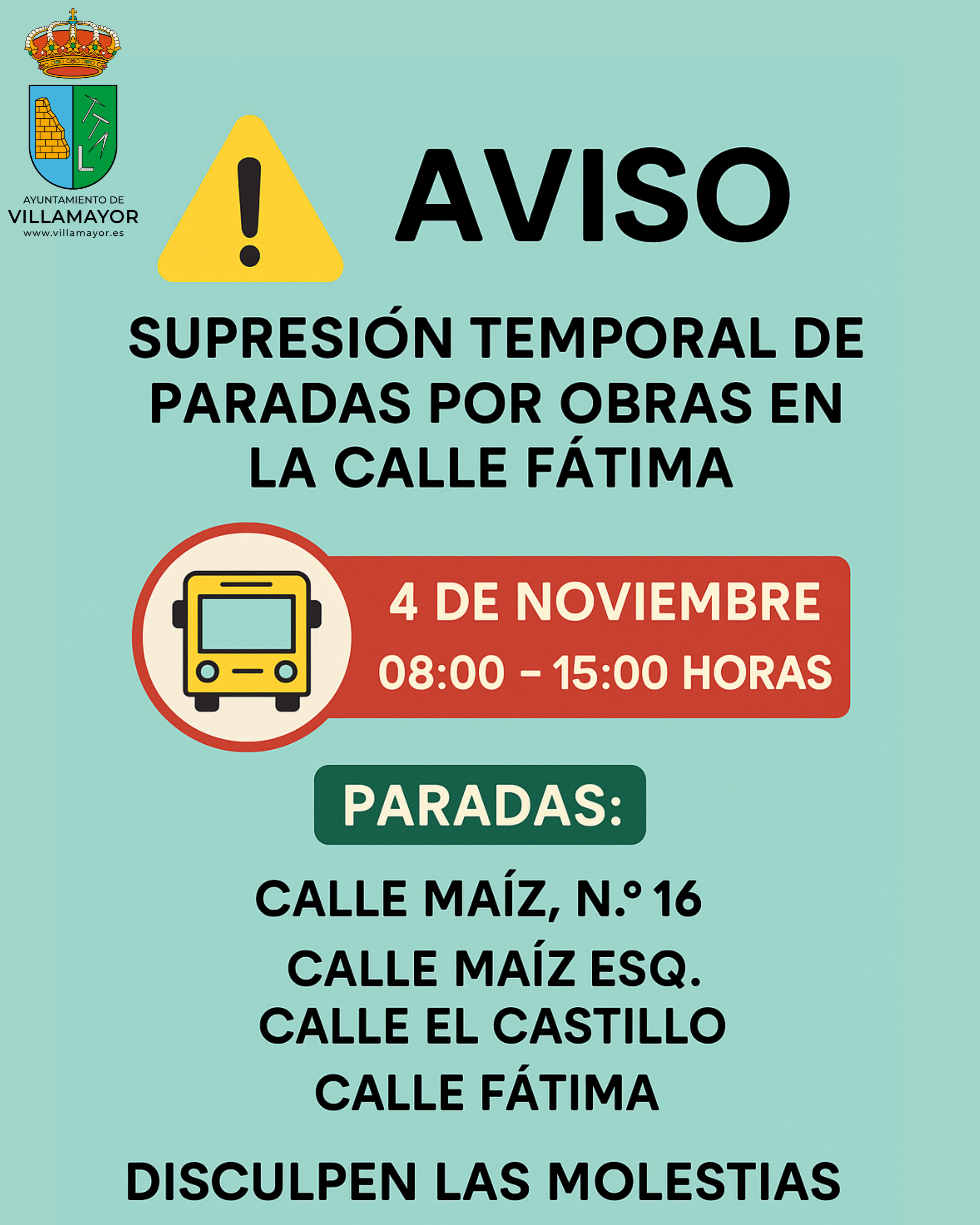 El Ayuntamiento de Villamayor informa de que mañana, martes 4 de noviembre de 2025, con motivo de las obras que se ejecutarán en la Calle Fátima, la Línea de autobuses Los Almendros – Villamayor – Salamanca verá suprimidas temporalmente las siguientes paradas: